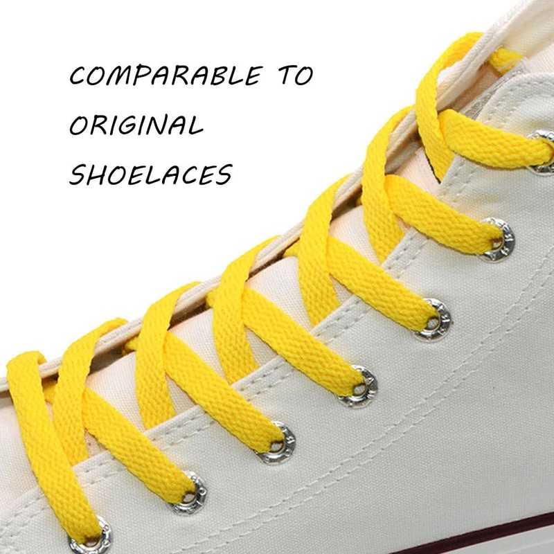 - SHOE STRINGS STYLE: Approximately 8mm wide flat golden yellow sneakers shoelaces - Polyester - Includes 2 pairs (4 laces) flat golden yellow shoestrings.