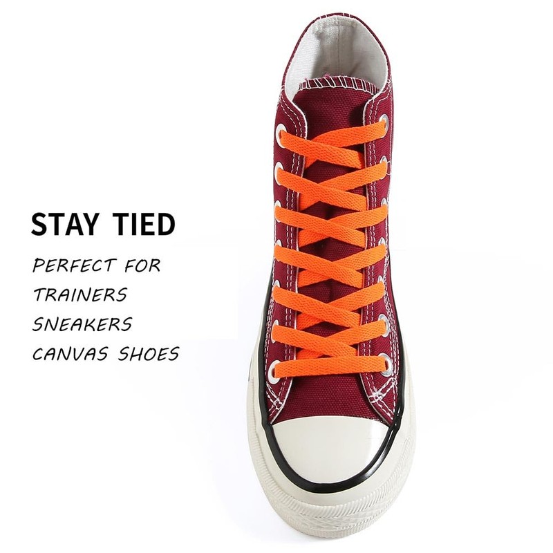 - FASHIONABLE FLAT ORANGE TRAINER SHOE LACES: A new right colour and length premium shoelaces will give your favorite sneakers or canvas shoes a new look and bring your shoes much more individual character.
