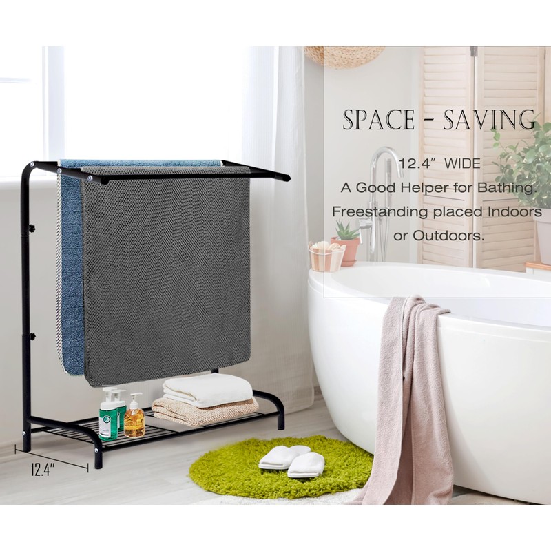 Our towel rack is only 12.4 inches wide on the sides and can be placed in aisles, bathrooms, pools, laundry rooms and more with guaranteed stability. It won't take up too much space in the room, ideal for towels. In order to adapt to more environments, we designed three heights 29.8 inches, 33.8 inches and 37.8 inches, you can flexibly choose the height you need. Make bath towels more breathable, dry quickly and prevent odor. To store extra items, there is a bottom shelf that creates more storage space for storing dry bath towels, bath products, organizers and more.