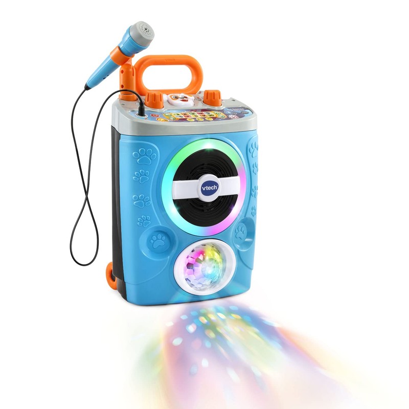 Set the stage and put on a show wherever you go with the Kidi Superstar Jr. Karaoke™! Singing your heart out has never been easier: roll in this portable machine, set up the mic, and choose one of ten built-in lyrical songs and popular melodies. Sing along in harmony or drop the vocals for a solo performance. Keep the concert going! Expand the set list by using Bluetooth® wireless technology to connect your favorite music, allowing a singalong with any song. Switch things up: change the tempo speed, then use voice effects to match the tone. You can even sound like a silly robot! Dance to four different music styles and add colorful light effects for the full experience. All that’s left to do is receive a standing ovation from your fans! Intended for ages 3+ years. Requires 4 AA batteries. Batteries included for demo purposes only. New batteries recommended for regular use.
