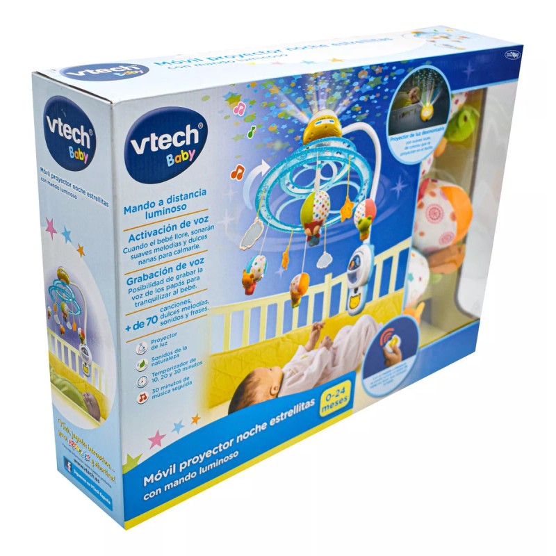 El Móvil Proyector Noche Estrellitas Bebé Juguete Vtech es un juguete diseñado para ayudar a los niños a conciliar el sueño y crear un ambiente relajante en su habitación. Incorpora un proyector de cuna extraíble que proyecta imágenes de estrellitas y luces de colores en la pared y el techo de la habitación del bebé. Incluye cuatro animalitos de texturas suaves que se pueden quitar y poner, permitiendo que el bebé juegue con ellos.