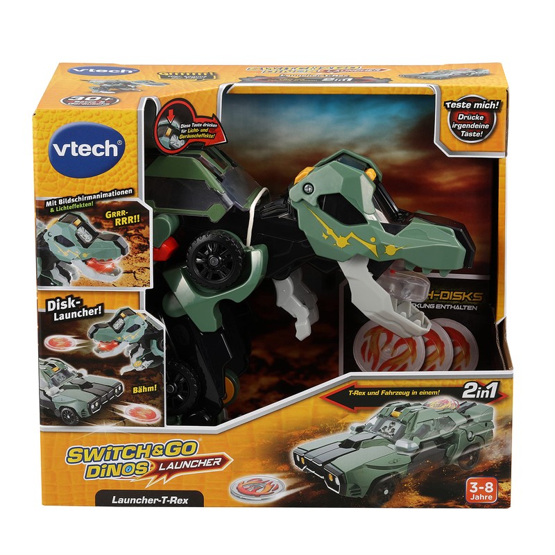 - Lieferumfang: 1 x VTech Switch and Go Dinos Launcher-T-Rex / Mit Abschaltautomatik und Lautstärkeregler / Deutsche Version / Alter: 3-8 Jahre / 2 x AAA/L03 Demobatterien / Art. Nr.: 80-559004