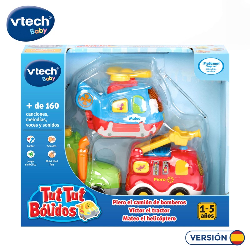 - Set de 3 divertidos vehículos de la colección tut tut con voz, luces, melodías y canciones piero el camión de bomberos, víctor el tractor y mateo el helicóptero