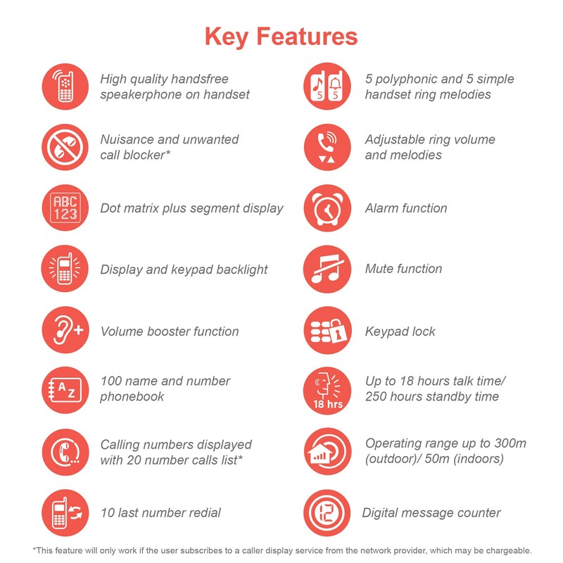 - [MORE FEATURES] - Caller ID / Call Waiting (20 Records), Backlit Display & Keypad, Alarm, Mute, 10 Last Number Redial, 100 Name & Number phonebook, Handsfree Speakerphone & 3 Speed Dial numbers, ECO mode