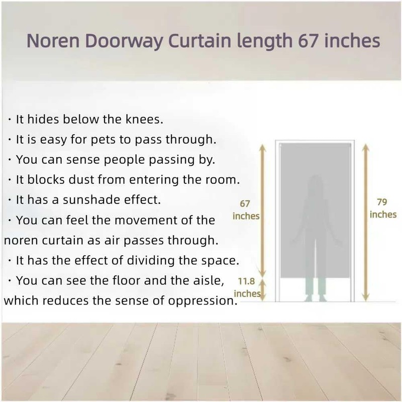 - 2. Size (W x H): Approx. 33.5 x 67 inches,The most popular and classic size in our store. This long-type Noren Japanese Doorway Curtain serves as a doorway divider, providing privacy, decoration, and protection from sun, wind, and dust. It can be hung between rooms, on walls, in doorways, or in windows, making it a perfect fit for most doors.
