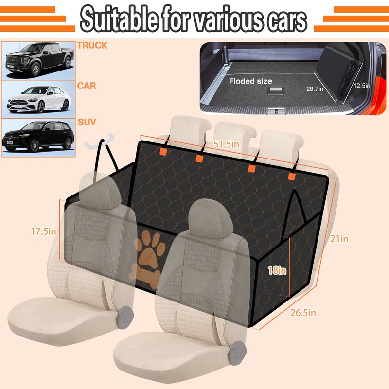 VTSGN Rugged Dog Back Seat Extender - Supports 330lb | Waterproof Car Seat Cover with Hard Bottom - Detachable, Durable, Scratch-Proof, Nonslip | Dog Hammock for Car & SUVs