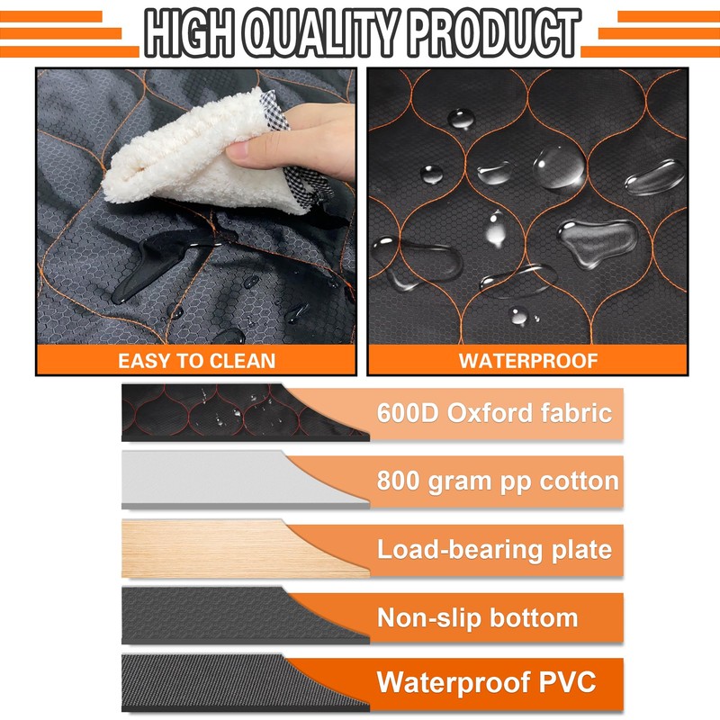 • The Dog car seat cover for the back seat is waterproof, non-slip, and wear-resistant, making it easy to clean when it gets dirty. It also has a non-slip design on both sides for added safety. The non-inflatable car bed mattress is stable and prevents the dog from sliding around during car rides or camping trips. The back seat bed inflatable for car is made with durable fabric, ensuring a longer lifespan and better quality.