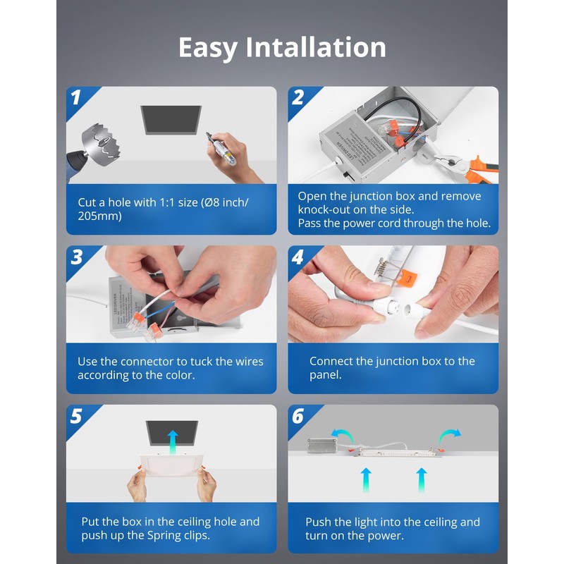 - INSTALLATION: LED can lights fixture has a Junction box and requires only 8.07" of ceiling space, making the installation process quick and easy; It has everything you need in one set; Just cut out the template, connect the box wiring to your light switch, and place it into your ceiling; Spring-loaded clips ensure a snug fit to the surface; This fixture is IC rated so there is no can or any other housing required.