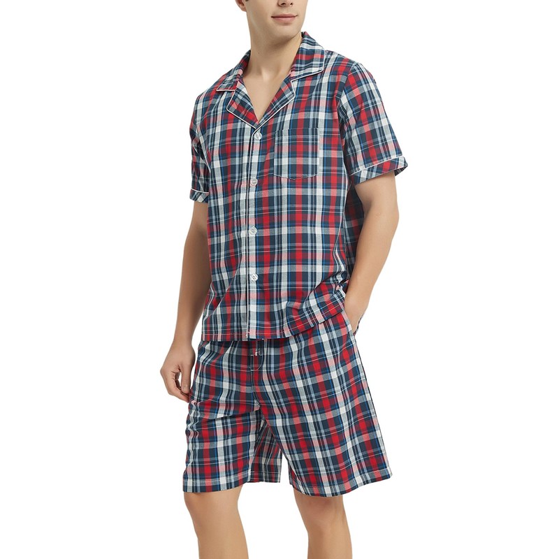 Vulcanodon Mens Cotton Pajama Set Short Sleeve, Button Down Pajama Set for Men Lightweight Men's Sleepwear(Red-Blue Plaid,M)