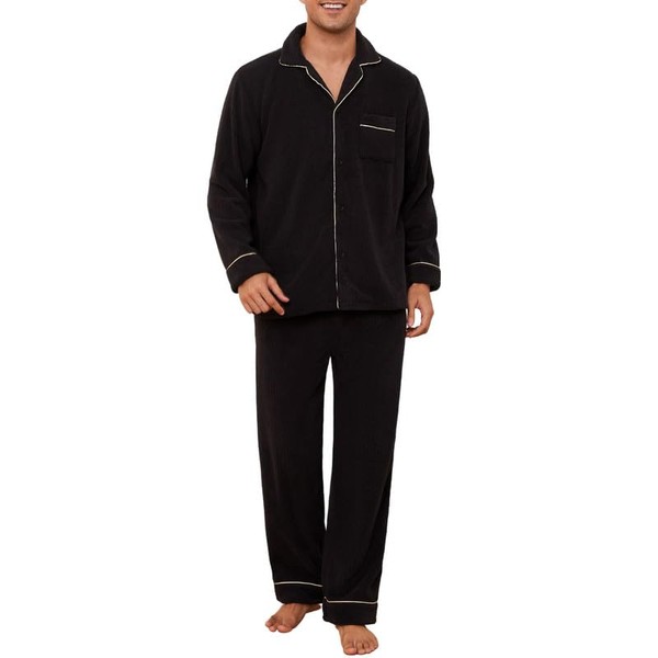 Vulcanodon Mens Fleece Pajama Set, Soft Warm Long Sleeve Sleepwear with Pockets Cozy Button-Down Pjs for Men(Black,L)