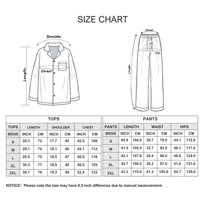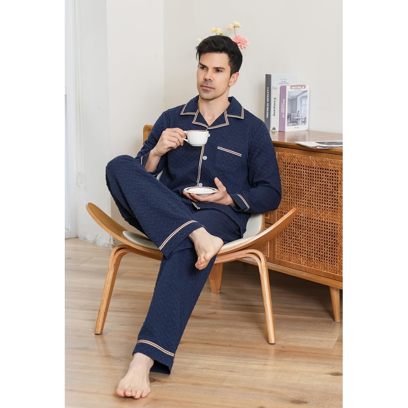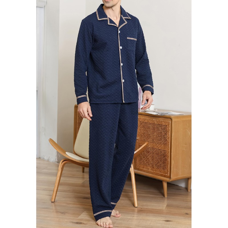 Men Pajama Set:smooth, soft and comfy. Lightweight and skin-friendly material help you have a sound sleep at night Classic Lapel Design: The top of the men's long sleeve pajama set features a classic lapel design that is both stylish and comfortable. It includes a moderately sized chest pocket, perfect for holding business cards, eyeglasses, and other small lightweight items Enhanced Durability and Style Options: Reinforced pockets and crotch area to prevent damage, ensuring longevity. The pajama pants also have a convenient front opening for men Adjustable and Secure Fit: Pants feature an elastic waistband with an adjustable drawstring for a customizable fit. Double-stitched elastic to prevent twisting, with a fixed drawstring at the back to avoid misplacement