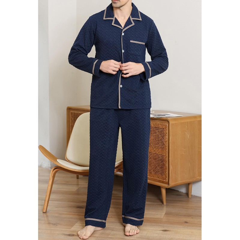 • Stylish Design: This men's sleepwear features a classic and fashionable design with a notched collar, a top-left pocket, and contrast piping, perfectly paired with jacquard fabric to create an elegant look. Even at home, you can showcase a mature and confident charm in this sophisticated pajama set.