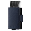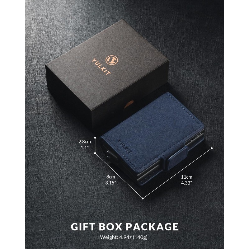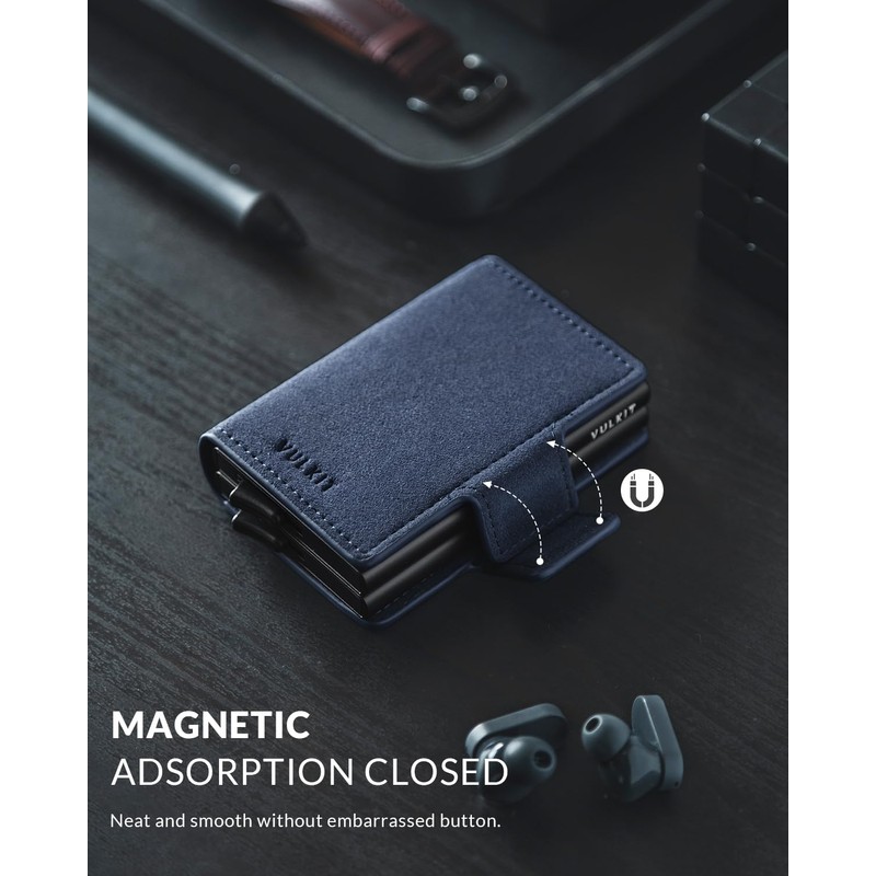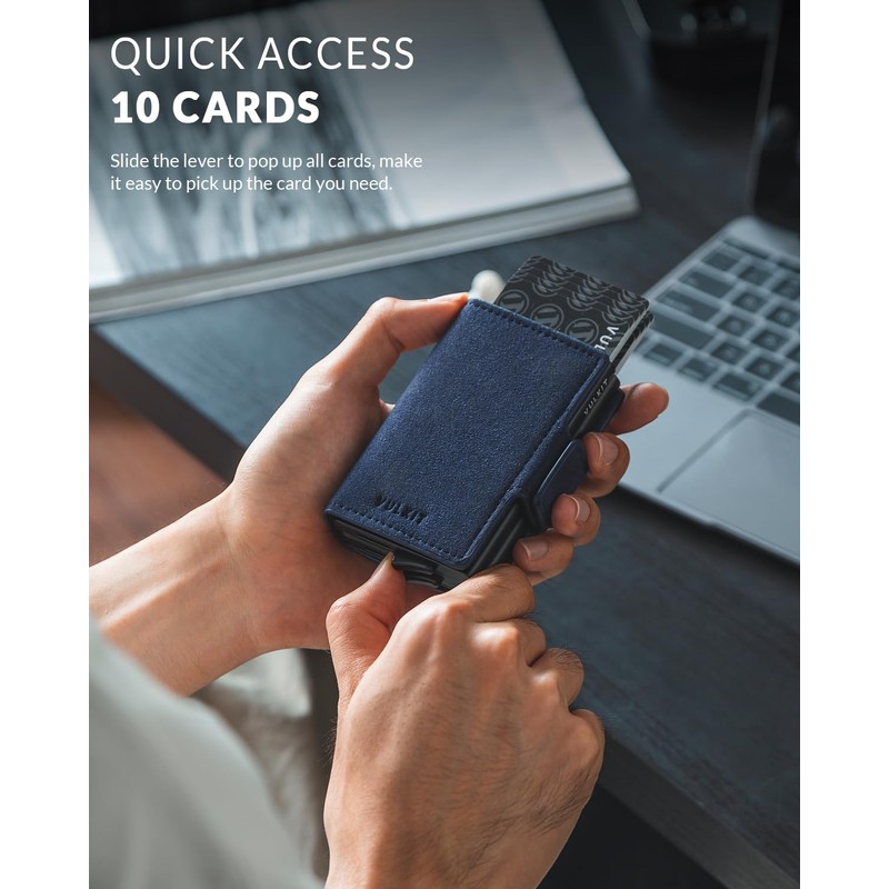 VULKIT Credit Card Holder RFID Blocking Leather Automatic Pop Up Wallet Magnetic Wallet Double Card Case for Men and Women, Alcantara Navy, Minimalist