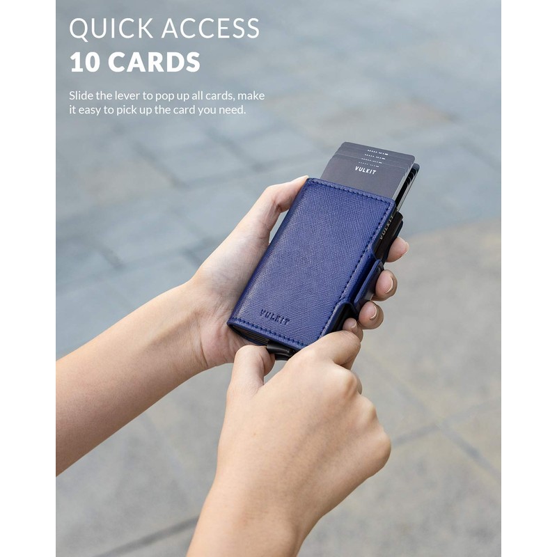 VULKIT Credit Card Holders for Men RFID Blocking Double Pop Up Metal Case Leather Men's Wallets Magnetic Closure with 2 Slots for 10-14 Cards, Cross Navy