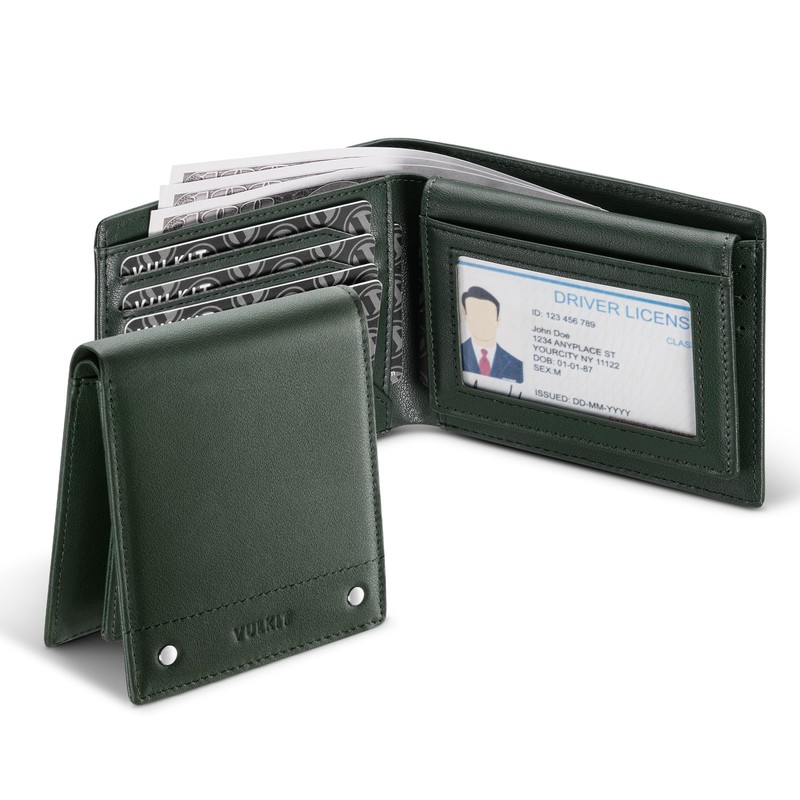 VULKIT Men's Bifold Wallet Genuine Leather Wallet RFID Blocking with Multiple Card Slots and Double ID Windows Everyday Carry Wallet, Nappa Green, Classic