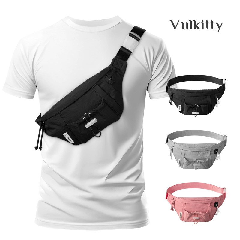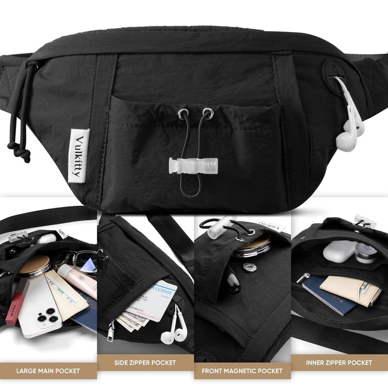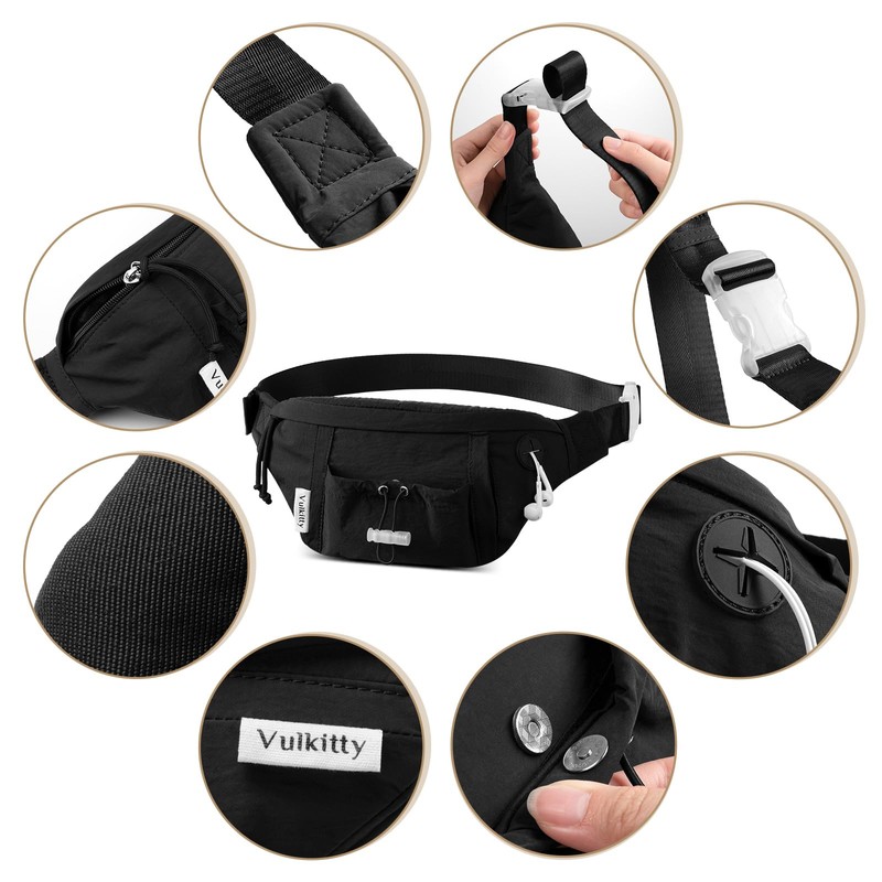 Vulkitty Bumbag for Men Women, Black Fanny Pack with Adjustable Belt, Headphone Jack, Multiple Pockets, Water-Resistant Fabric, for Running, Hiking, Travel