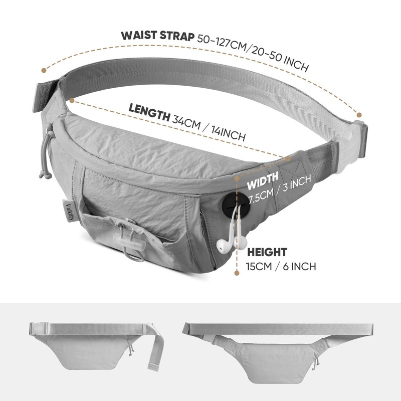 Vulkitty Bumbag for Men Women, Grey Fanny Pack with Adjustable Belt, Headphone Jack, Multiple Pockets, Water-Resistant Fabric, for Running, Hiking, Travel
