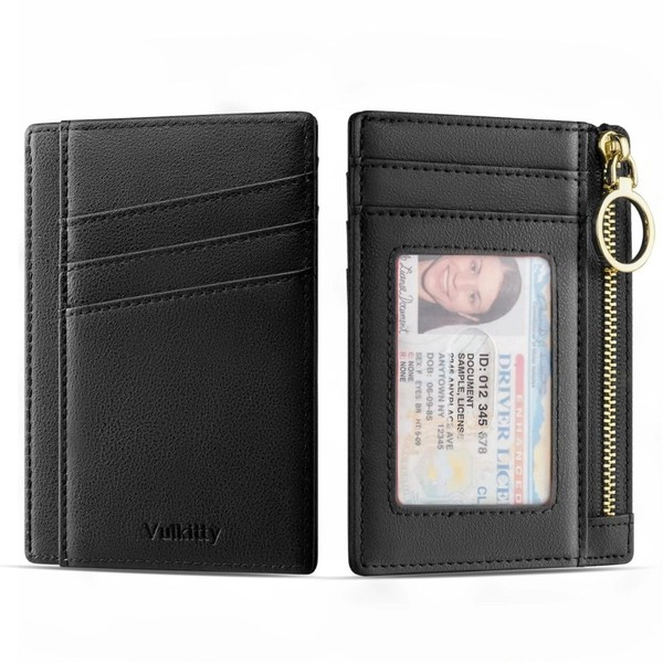 Vulkitty Small Wallet for Women Minimalist Slim Front Pocket Zipper Wallet RFID Blocking Credit Card Holder with ID Slot Window Keychain Black