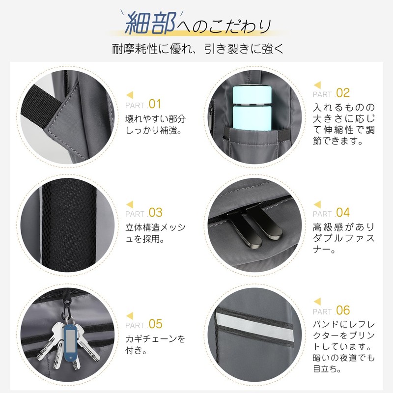 - 8 Attention to Quality: 1. Firmly reinforced fragile areas and carefully stitched. ② The elastic can be adjusted according to the size of the side pocket inside. 3. The backpack strap uses a three-dimensional mesh structure to reduce the burden on the shoulders while providing excellent breathability. ❹Simple yet classy with double zipper for easy use. 5) Comes with a key chain so you can store small items. 🌸 Reflectors are printed on the band, so you can stand out on the dark night roads. Front pocket for storing items that you want to quickly access. The back pocket protects your important items, so you can rest assured that it is often damaged by theft