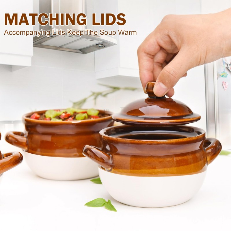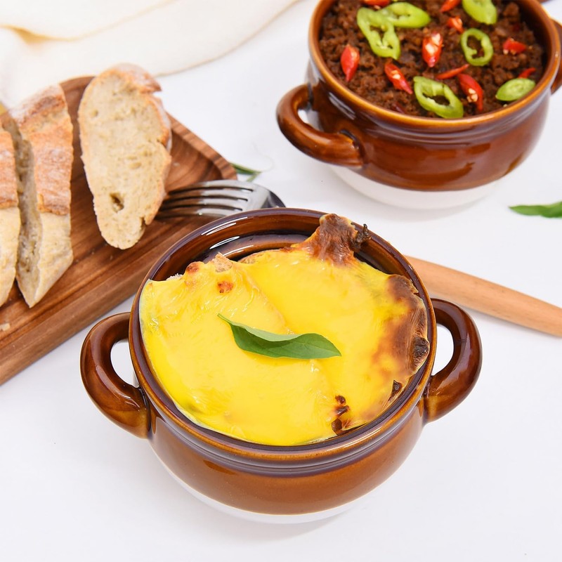 The ceramic oven proof soup bowls are perfect for French Onion soup, Tortilla soup, Pot pies, Stews, Chili pots, Biryani, Cereal, butter, or other side dishes. They're ovens, microwaves, freezers, broil, and dishwashers safe for maximum convenience.