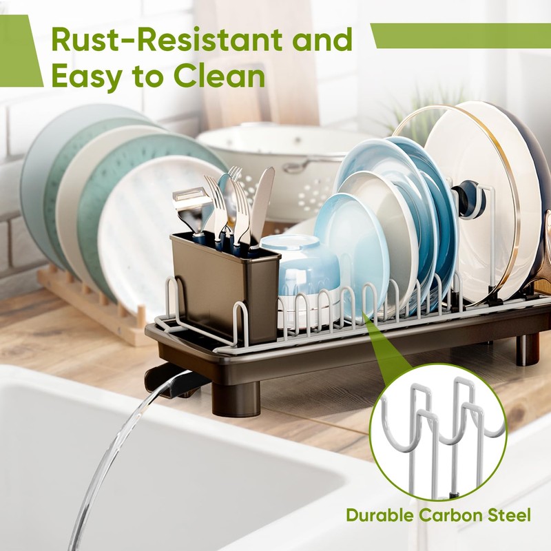 - 【Auto-Drain System with Retractable Spout】This dish rack features a 360° rotatable, extendable drainage spout that directs water right into your sink—and retracts neatly into the base when not in use for a cleaner look. Even the utensil holder has its own drain outlet, this dish rack drying rack keeping everything dry and sanitary.