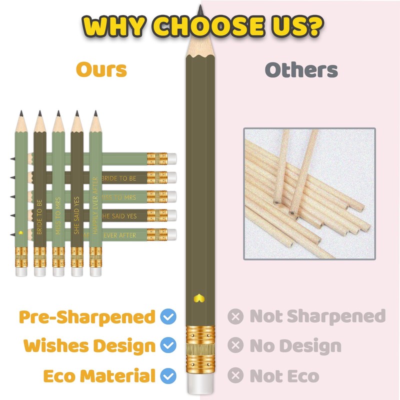 • 5 Designs: 10 pencils per design, to bring a touch of joy to your bridal shower games and activities