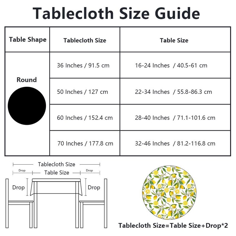 - 🍋PREMIUM QUALITY ROUND TABLECLOTH : round tables are made of 100% polyester skin fabric, printed with high quality. Top quality cloth and exquisite workmanship ensure its anti-fading and shrinking resistance, and long-lasting durability.Its stain and wrinkle resistance features add a classy touch to any plain table, giving it seamless beauty.