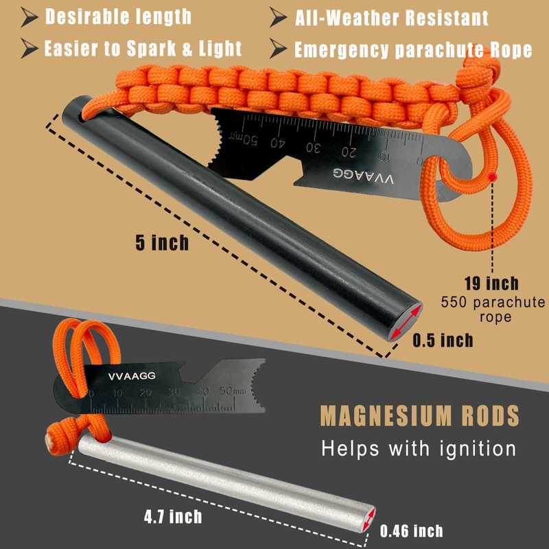 VVAAGG Magnesium Flint and Steel Fire Starter Kit, Flint Fire Starter Tool with Orange Paracord Landyard Handle and Striker, 1/2"" x 5"" Large Ferro Rod, VVFR01