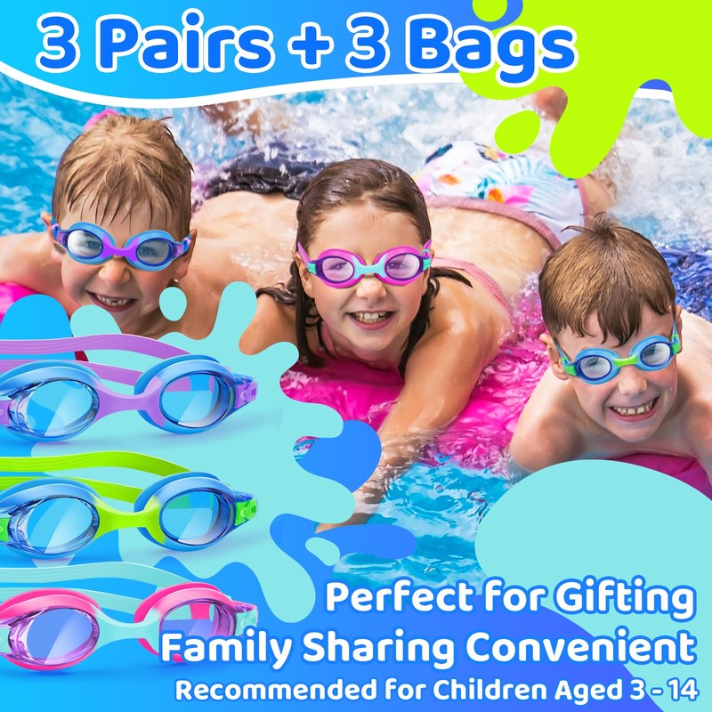 - 【Triple the Fun, Zero Regrets】 Three goggles = three times the adventures! Packed with rainbow colors and waterproof pouches, our kids swim goggles are perfect for siblings, sleepovers. If anything breaks in a year, we'll send replacements hassle-free.