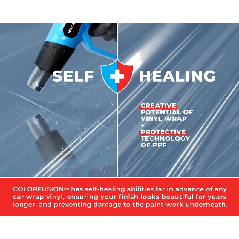 - Exceptional Self-Healing: ColorFusion has self-healing abilities far in advance of any car wrap vinyl, ensuring your finish looks beautiful 2 x longer than other wraps, and preventing damage to the paint-work underneath. Gently apply heat with a heat gun, and watch your ColorFusion wrap heal from scratches that would spell the end for any other film.