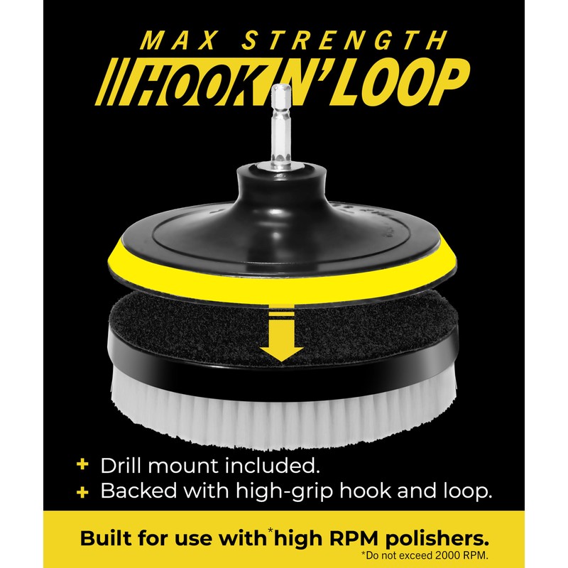 The VViViD Drill Backing Plate and Medium-Stiff Bristle Brush Attachment is the ideal combination for cleaning heavy grime on durable surfaces including wood, and general cleaning such as carpets and rugs, outdoor / indoor furniture, car convertible tops, etc. Our backing plate is built for high rpm drills, up to 12000 rpm with sand-paper or other light attachments (do not exceed 2000 rpm when using heavier attachments, such as the supplied scrub-brush). The 4” inch / 100mm diameter scrubbing brush has the ideal surface area for cleaning, cutting, polishing, waxing and sanding smaller shapes and contours. It’s ¼” inch bit locks firmly into your drill’s chuck, unlike screw-in attachments which can unscrew during use, creating a safety hazard and potentially damaging the surface you are working on. Lined with heavy-duty hook-and-loop, this durable backing plate grips attachments tightly, for safety and ease-of-use. The VViViD backing plate and brush attachment combo has your needs covered.