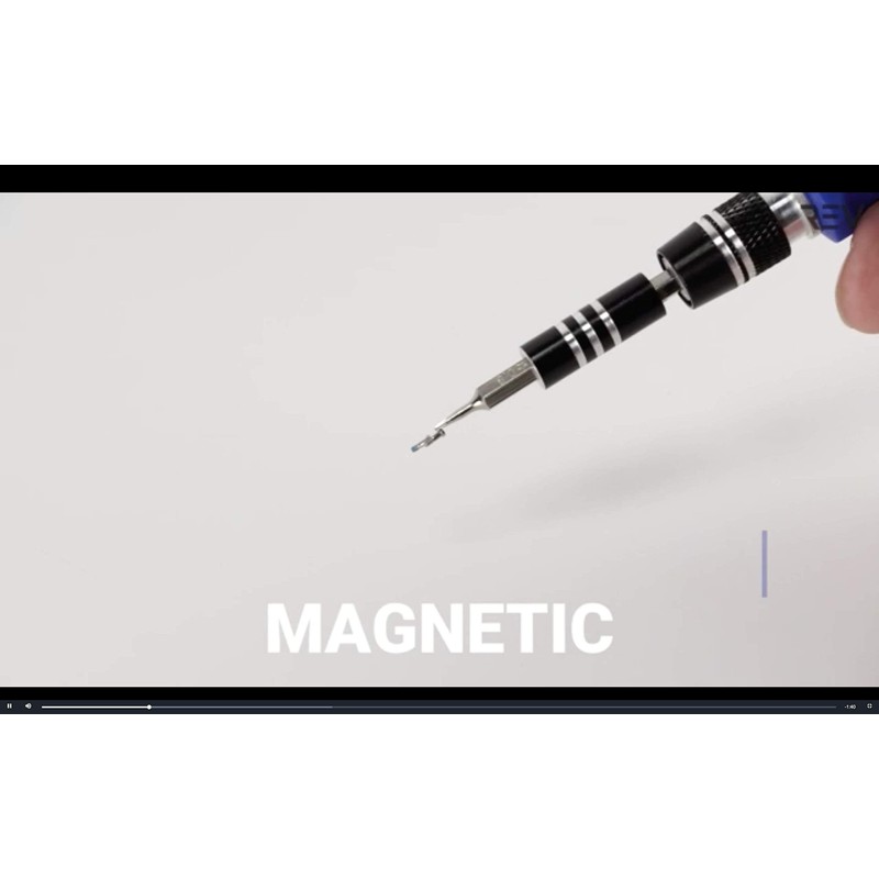 - Complete kit includes a 58 piece screwdriver set, 1 utility knife, 1 suction cup with SIM card ejector pin, 1 anti-static wrist strap, 3 fine point tweezers, 3 plastic opening and prying tools, 2 plastic spudgers, 4 metal spudgers, 6 triangle plectrums, 2 white gloss finish magnetic strips, 1 microfiber cloth and a 2-in-1 magnetizing and demagnetizing tool.
