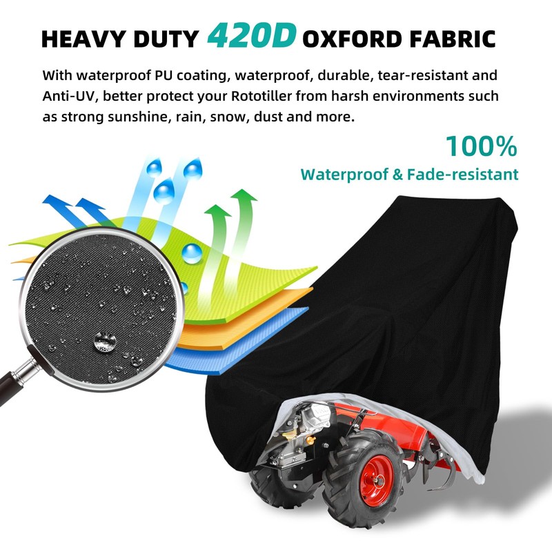 - ⭐【UPGRADED MATERIAL】Rototiller Cover is made of 420D Oxford fabric with waterproof PU coating, better protect your garden rototiller from harsh environments such as strong sunshine, rain, snow, dust and more.