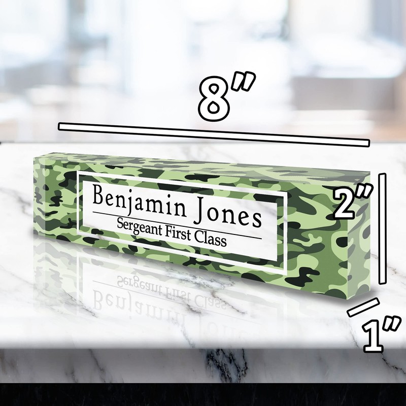 - Custom Camouflage Acrylic Nameplate Desk Sign. Enter custom name. Job title optional.