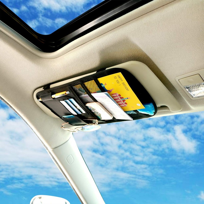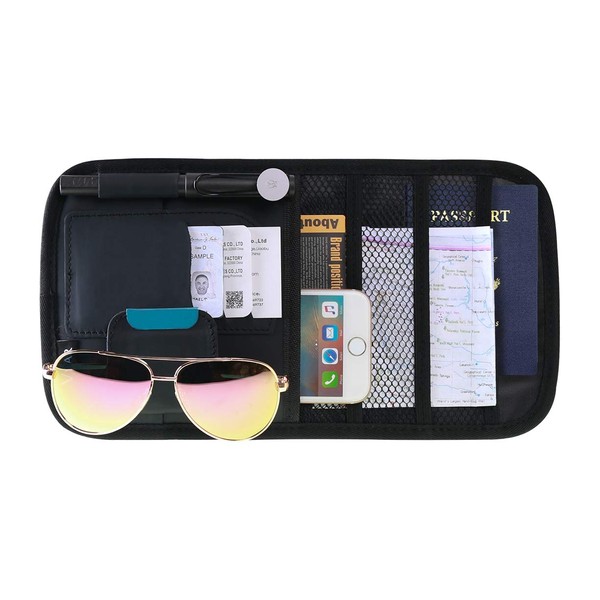- Sun visor organizer: 3 mesh bags for document, map, wallet, driving licence and mobile phone…. 3 cards pocket, 1 sunglasses holder, 1 pen holder.