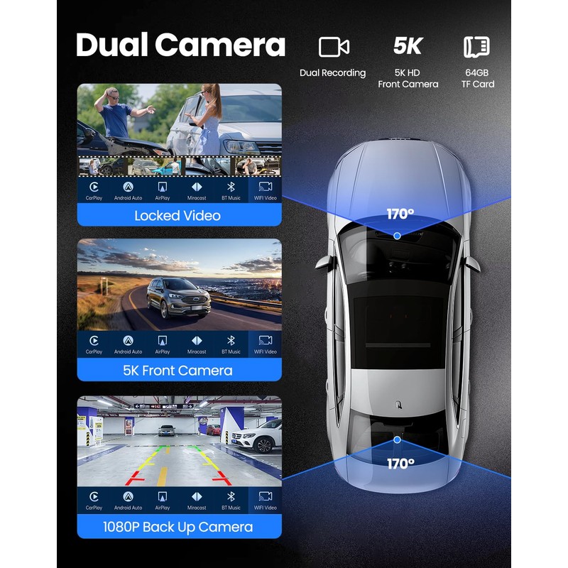 - 5K Dash Cam & 1080p Backup Camera: The car component subwoofers is equipped with 5K HD front camera and 1080P waterproof rear back camera for clear rearview and parking assistance The newly upgraded 5K front camera enhances the smoothness of driving. Dual screen loop recording provides comprehensive recording for your journey (Included a 64G TF card)