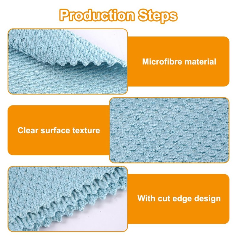 - Fibre material: microfibre cleaning cloths are made of microfibre material, the surface structure is clear, soft and lint-free. Microfibre kitchen towels have a cut edge design that can effectively prevent the edges from stripping, and can extend their use cycle.