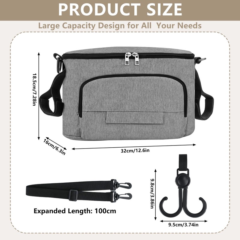 - Large capacity: the pram organiser measures 32 x 16 x 18.5 cm. It can hold baby lotion, wipes, tissues, bottles, milk powder cans, nappies, towels, small toys and more. It is easy to organise, has your hands free and relieves you on everyday trips.