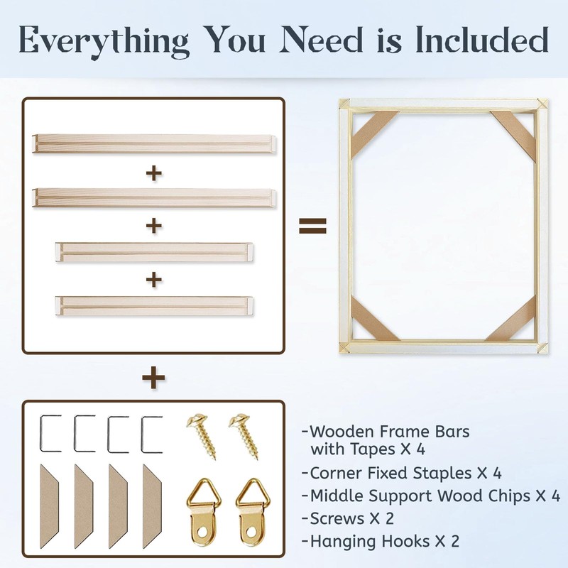 - SUPER-EASY TO ASSEMBLE: All hardware Accessories are included. All you need is a pair of scissors. That's it! No need for pliers, glue or any other tools. Our canvas stretcher frame is extremely easy to assembling together, thanks to the well-made bars that fit together perfectly at the corners. You can refer to the video and A+ installation instructions for more details.