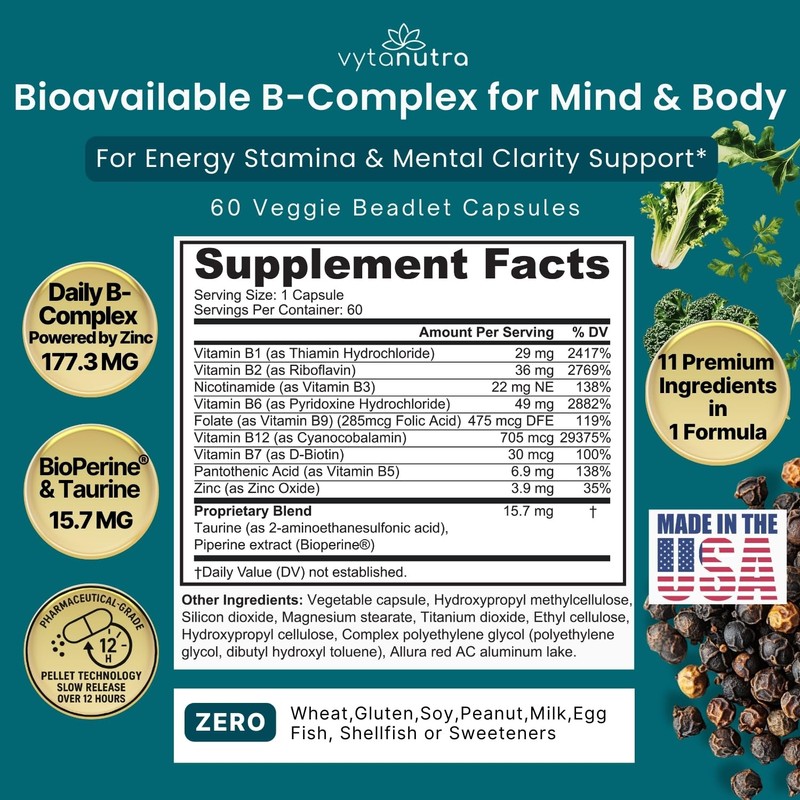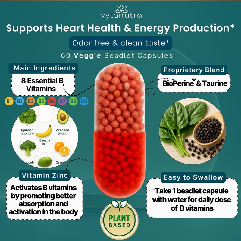 Vytanutra Plus B Sustained Slow Release Pellet Beadlet Capsule Contains All B (1, 2, 3, 5, 6, 7, 9 - Folic Acid, B12) Plus Taurine with Bioperine