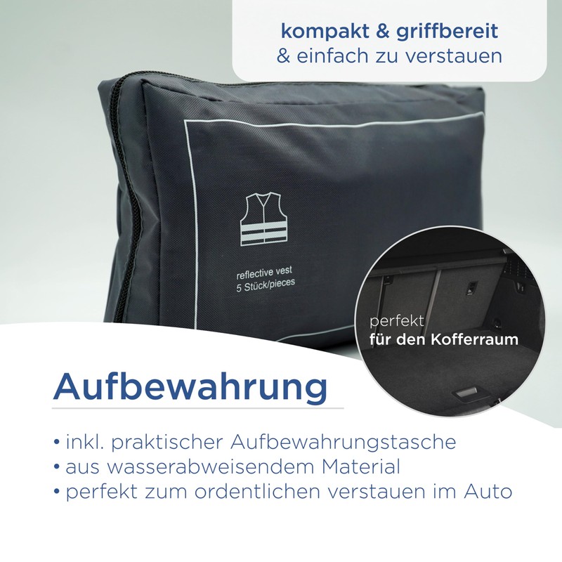Mit den hochwertigen VZL Warnwesten fr Auto, Fahrrad und Motorrad sind Sie in jeder Situation optimal sichtbar und gesetzlich auf der sicheren Seite. Unser Set enth?lt wahlweise 2, 3 oder 5 Warnwesten, ideal fr Familien, Firmenfahrzeuge oder Fahrgemeinschaften. Jede Warnweste entspricht der EN ISO 20471 Norm und ist TV-geprft C damit Sie sowohl bei Tag als auch bei Nacht bestens geschtzt sind. Egal ob als Warnweste Auto fr den Notfall, als Warnweste fr Kinder auf dem Schulweg oder als Rettungsweste fr Erwachsene beim Panneneinsatz C unsere Sicherheitswesten sind vielseitig einsetzbar. Auch bei Fahrradtouren oder Motorradausflgen bietet die Warnweste Fahrrad bzw. Warnweste Motorrad zus?tzliche Sicherheit. Unsere reflektierenden Warnwesten Auto Sets sind die perfekte Wahl fr Privatpersonen, Handwerker, Fahrdienste und alle, die vorbereitet sein wollen. Sie lassen sich platzsparend im Fahrzeug verstauen und schnell berziehen. Ob Sie eine einzelne Rettungsweste, ein Warnwesten 4er-Set fr mehrere Fahrzeuge oder eine Warnweste fr Kinder in der Schule ben?tigen C mit VZL setzen Sie auf geprfte Qualit?t und maximale Sichtbarkeit.