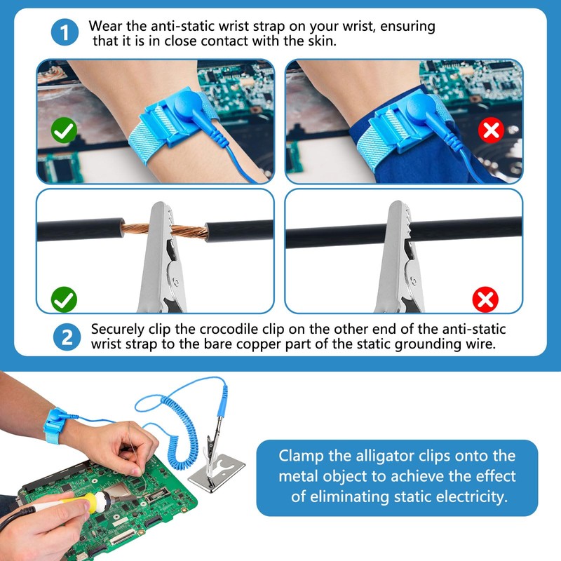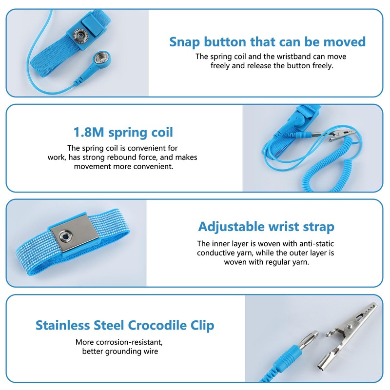 • 【Effective ESD Safeguard】Features a low-resistance (<10Ω) stainless steel snap for reliable static discharge, preventing damage to sensitive PCBs, chips, and electronic components during handling or repair.