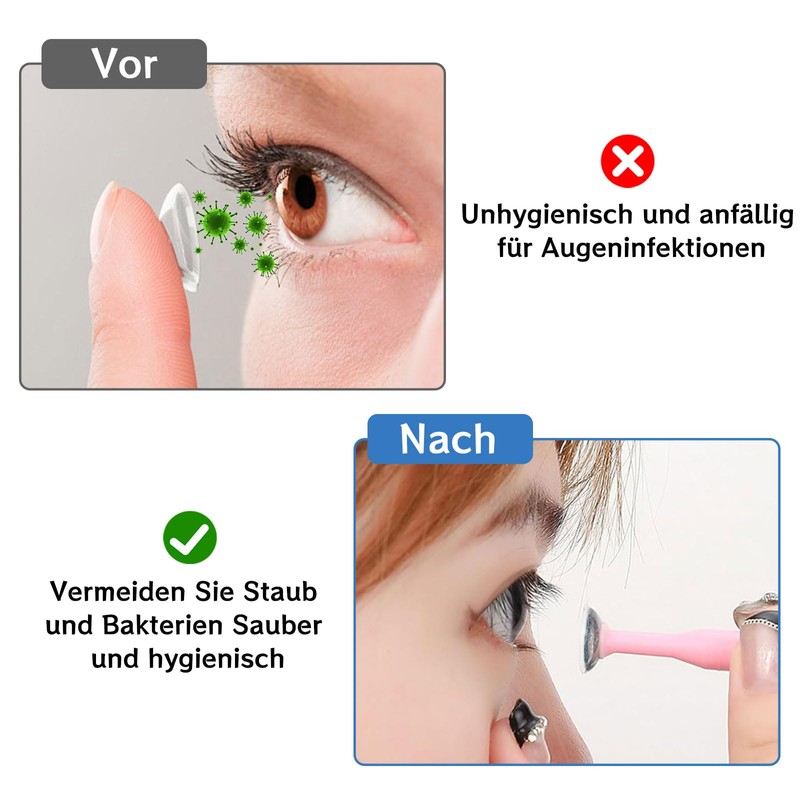 - Easy to use: with the contact lens insertion aid, you can easily insert and remove your contact lenses. Use the tweezers to pick up the lens and the suction cup to insert it safely into your eye. Ideal for home use and travel.