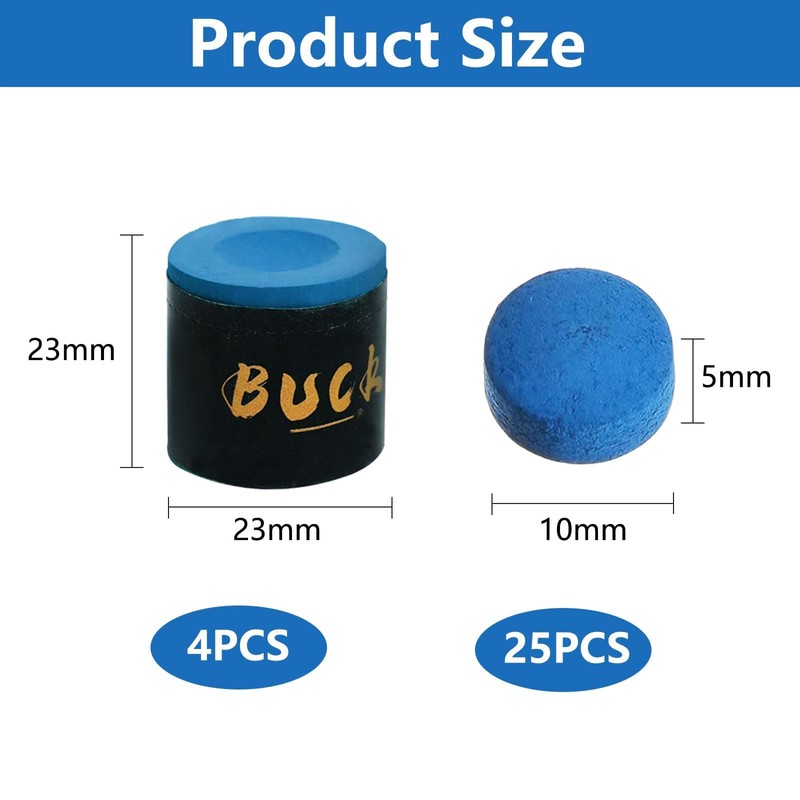 - Tragbare und praktische Größe: Unsere Billard-Queue-Kreiden sind kompakt, 2,3 x 2,3 cm, einfach zu transportieren und aufzubewahren. Enthält 4 Stück Kreide und 25 Pool Queue-Ersatzspitzen, Sie können es mitnehmen, um Ihre Queue-Spitzen für jedes Spiel in bestem Zustand zu halten. Perfekt für Spieler unterwegs.