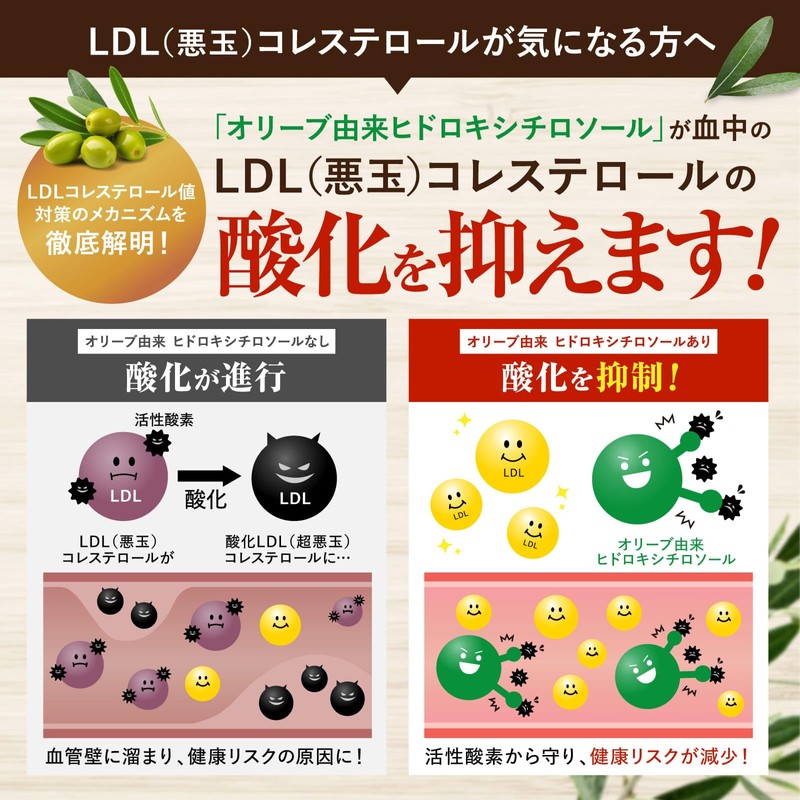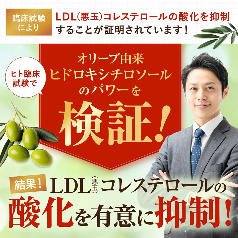 - ✅【LDLコレステロールケア】本品にはオリーブ由来ヒドロキシチロソールが含まれます。オリーブ由来ヒドロキシチロソールは抗酸化作用により、血中のLDLコレステロールの酸化を抑制させることが報告されています。