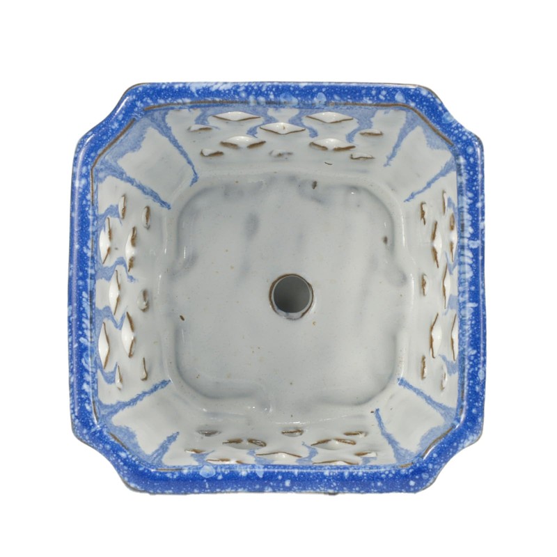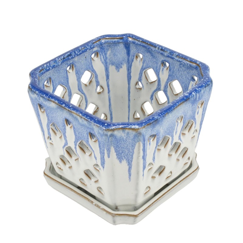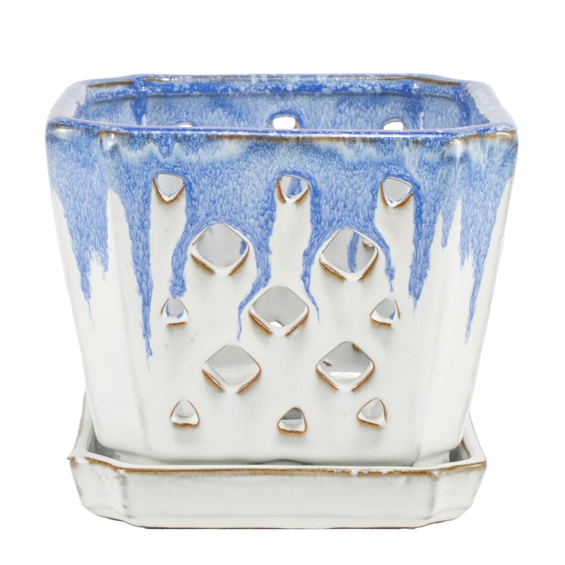 W&W Ceramic Orchid Pot with Drainage Holes and Saucer for Repotting (Blue and White)