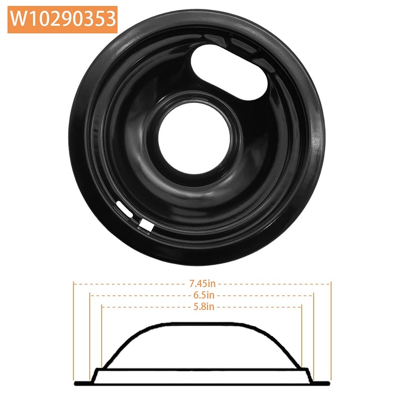 W10290353 Drip Pans replaces: 059011B, 300728, 0300728, 04100392, 04100527, 14202900, 14205730, 14210033, 14222661, 19950012, 305837B, 308648B, 308648BQ, 308937B, 309113B, 309427B, 3169204A, 3169204P, 59011B, 74002961, 74004068, 7725P022-60, 7725P040-60, 93159247B, D8576205, D8576206, W10132138, W10290353BU, Y0300728, Y04100392, Y04100527, Y059011B, etc.