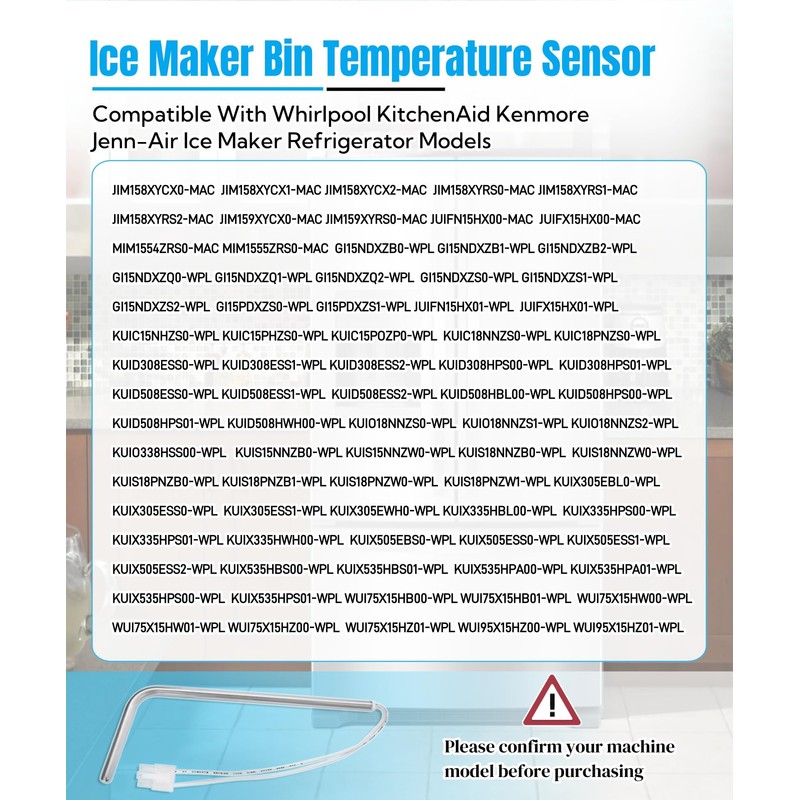 - Compatibility Models:Ice maker bin temperature sensor compatible with Whirlpool KitchenAid Kenmore Jenn-Air ice maker refrigerator models KUID508ESS0-WPL KUID508ESS1-WPL KUID508ESS2-WPL KUID508HBL00-WPL KUID508HPS00-WPL KUID508HPS01-WPL KUID508HWH00-WPL KUIO18NNZS0-WPL KUIO18NNZS1-WPL KUIO18NNZS2-WPL KUIO338HSS00-WPL KUIS15NNZB0-WPL KUIS15NNZW0-WPL KUIS18NNZB0-WPL KUIS18NNZW0-WPL KUIS18PNZB0-WPL KUIS18PNZB1-WPL KUIS18PNZW0-WPL KUIS18PNZW1-WPL KUIX305EBL0-WPL KUIX305ESS0-WPL KUIX305ESS1-WPL KUIX305EWH0-WPL KUIX335HBL00-WPL KUIX335HPS00-WPL KUIX335HPS01-WPL KUIX335HWH00-WPL KUIX505EBS0-WPL KUIX505ESS0-WPL KUIX505ESS1-WPL KUIX505ESS2-WPL KUIX535HBS00-WPL KUIX535HBS01-WPL