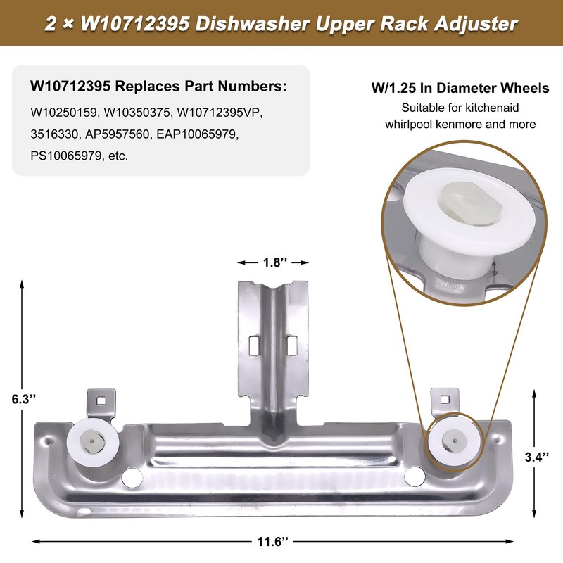 - Replaces Part Numbers: W10712395 Upper Rack adjuster replaces: W10250159, W10350375, W10712395VP, 3516330, AP5957560, EAP10065979, PS10065979. Compatible with models: WDTA50SAHW0, WDTA50SAHZ0, WDT750SAHZ0, WDT780SAEM1, WDT970SAHZ0, WDT910SSYM0, etc. Please confirm the wheel size of the original parts before purchasing. (the wheel size is 1.25in)