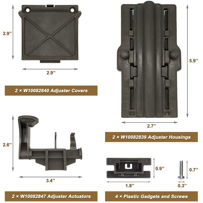 - 16pcs Dishwasher Upper Rack Replacement Parts: W10712395 dishwasher steel adjuster assemblies (2pcs), adjuster actuators (2pcs), adjuster covers (2pcs), adjuster housings (2pcs), plastic gadgets (4pcs), screws(4pcs). Compatible with Kitchenaid Whirlpool Kenmore dishwasher.